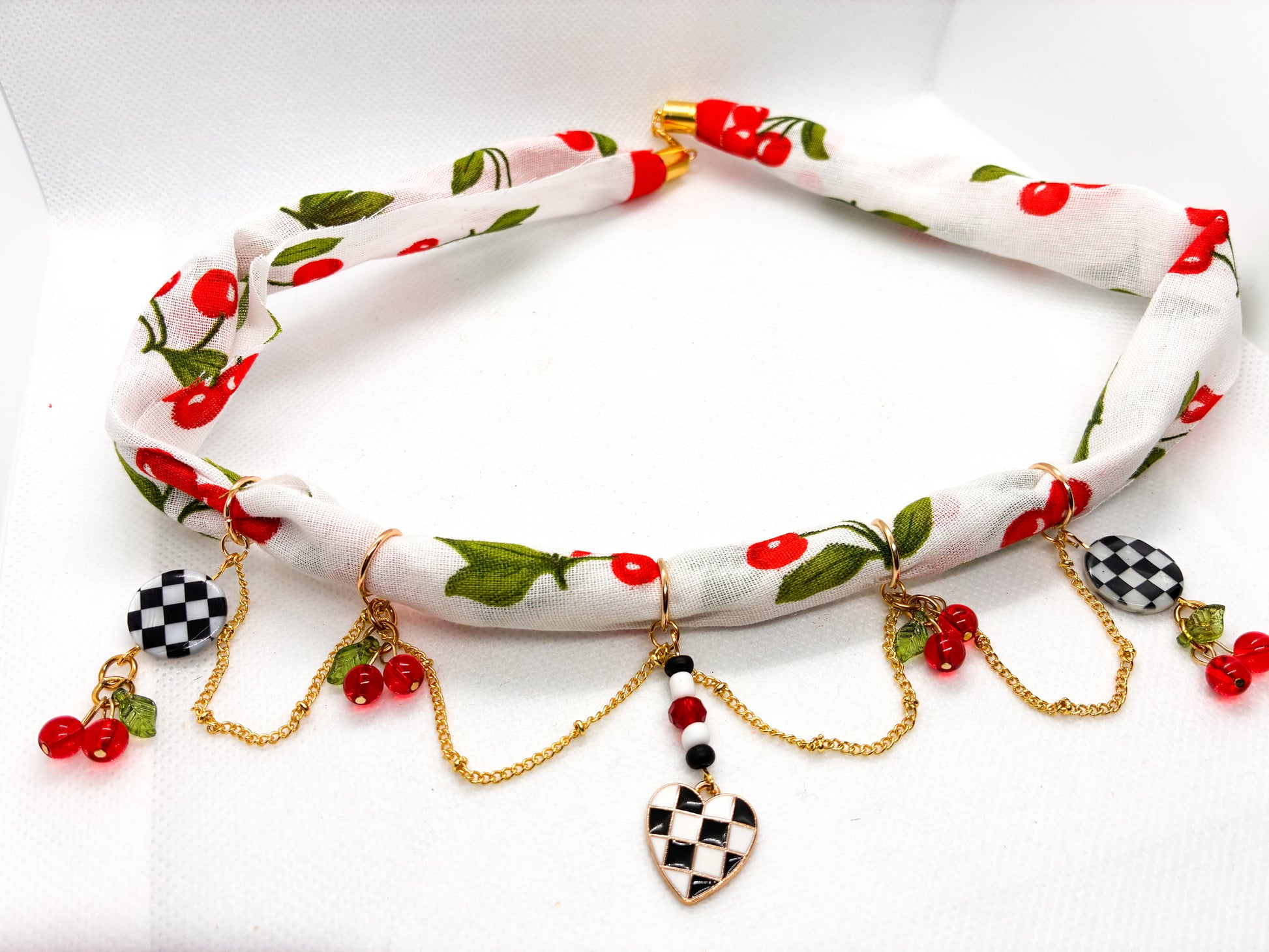 Get ready to cherry-pick your new favorite accessory! This Cherry Fabric Necklace features a delightful handkerchief design paired with snazzy gold chains and two-tone accents. It's the perfect way to add a splash of fun to your outfit (and trust us, your wardrobe will be berry grateful!).